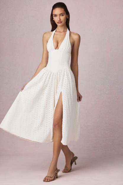 A modern classic. Crafted from premium broderie anglaise stretch cotton with a soft modal jersey lining, the Farrah midaxi dress is designed with a fitted V-shaped bodice and A-line skirt. It’s framed with a plunging halterneck, open back and thigh-high side split for stunning movement with every step.