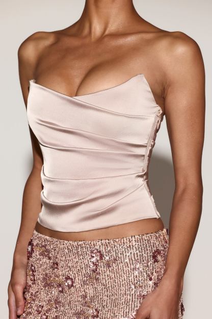 Bring the glam with our Yulea corset top, featuring a built-in corset for enhanced shaping and internal silicone tape for extra hold. Crafted from our premium satin fabric, it pairs perfectly with the Nevara Embellished Mid-Rise Maxi Skirt.