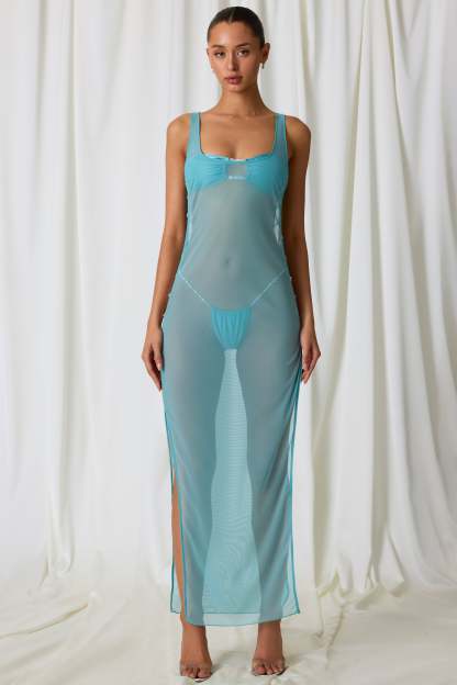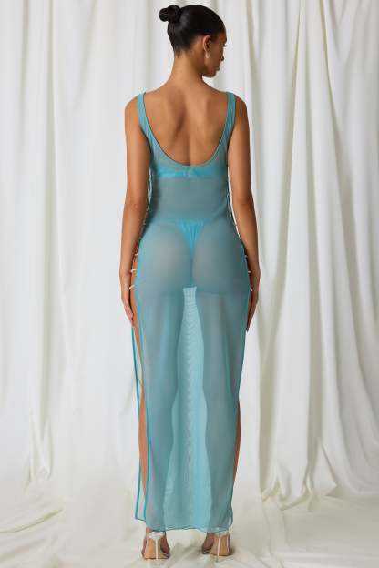 Sheer serenity. Create the ultimate beach-to-bar look with the Pacifica maxi dress. Ideal for slipping on over your favourite swimwear for beachside lunches or trips to the bar, it’s crafted from semi-sheer 20D power mesh with a touch of stretch and cut to a maxi-length silhouette with a scoop neckline. It’s elevated with cut-out detailing at the side, anchored with delicate faux-pearl embellishments that echo the ethereal aesthetic.