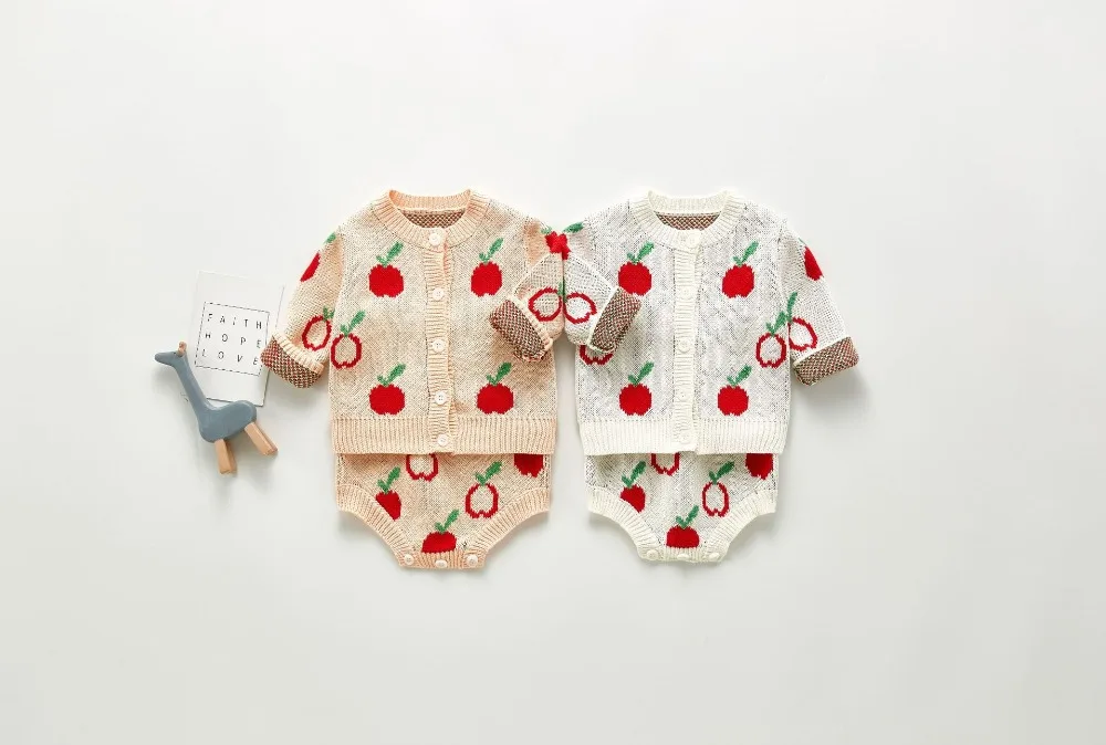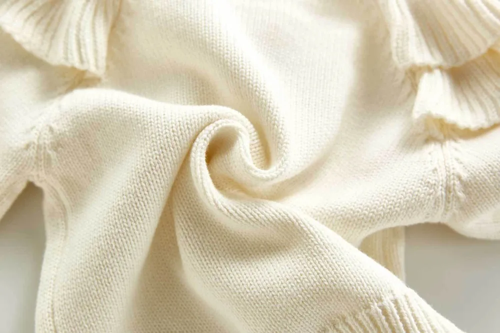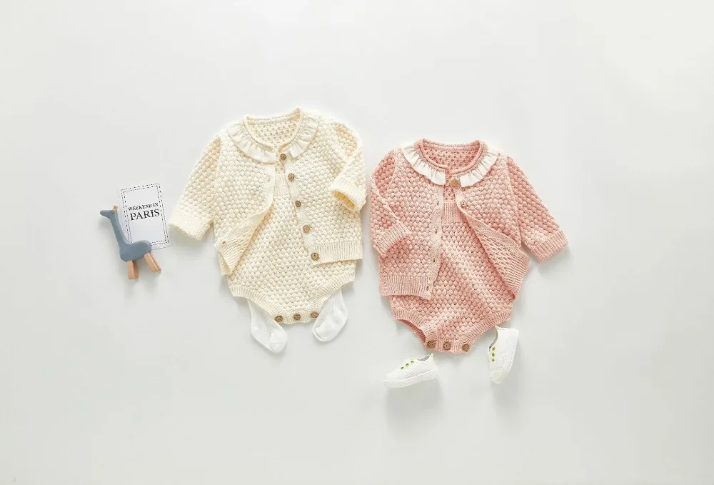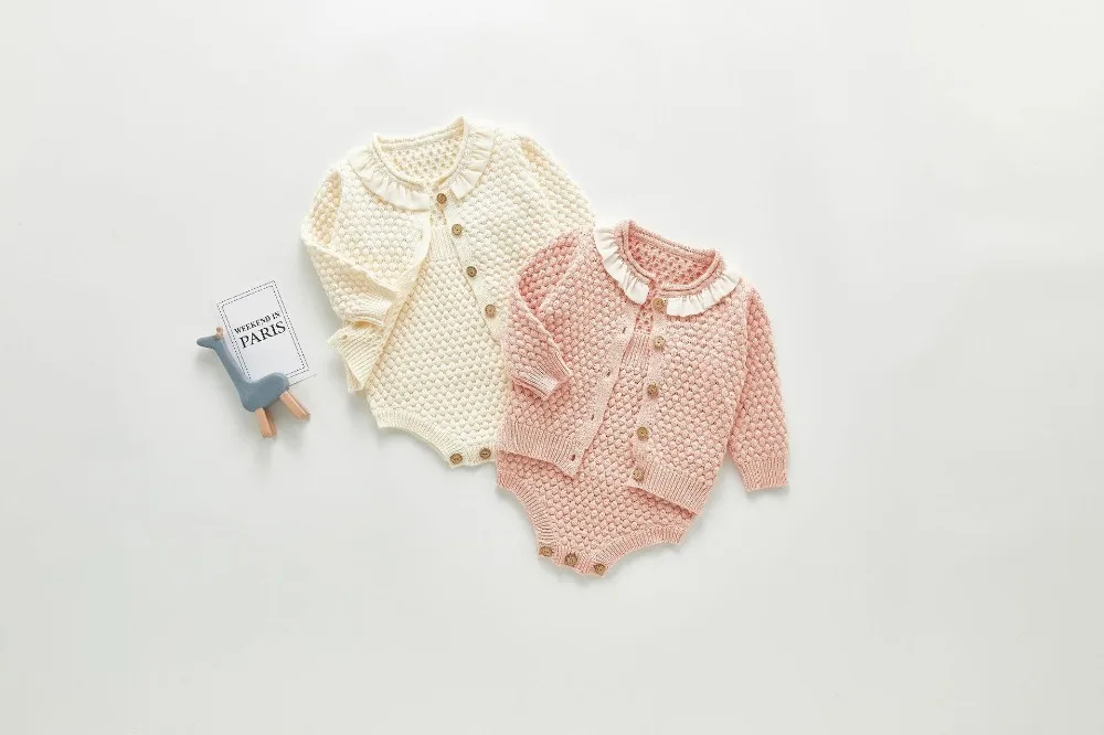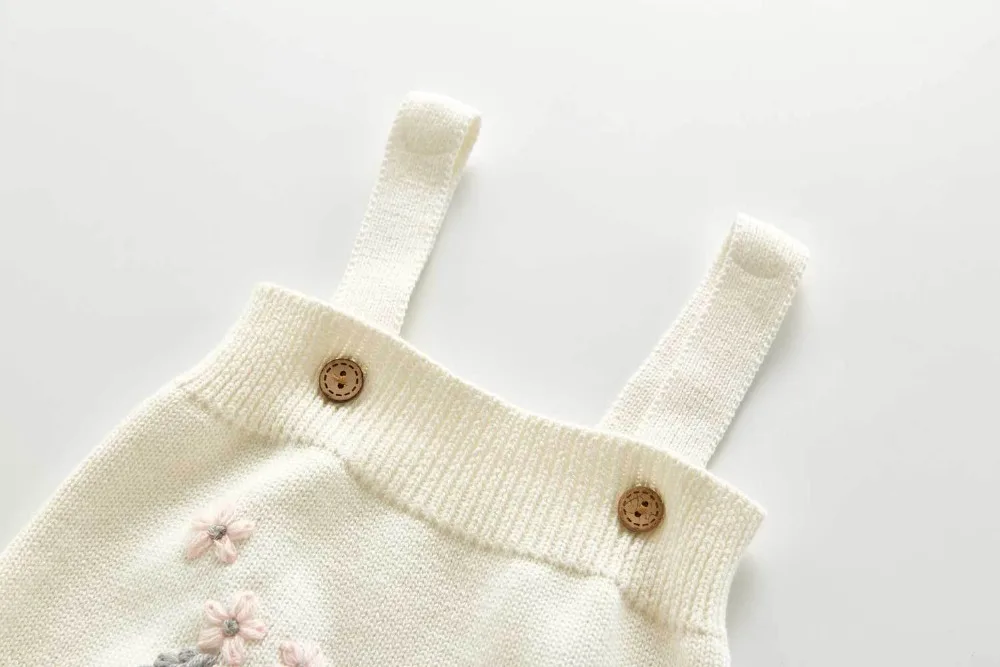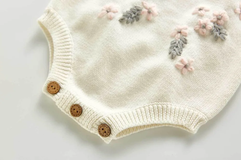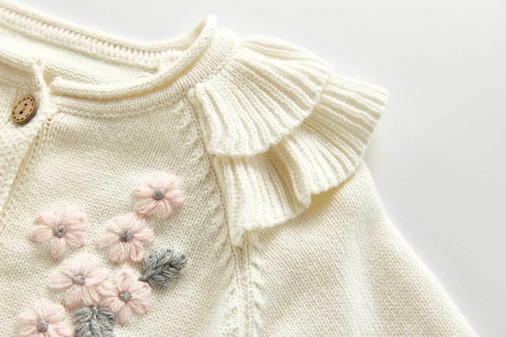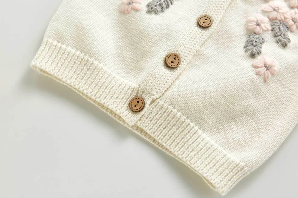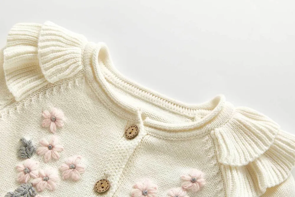 A beautiful baby knitted sweater romper is a must-have for your baby's wardrobe. Featuring a round neck, with ruffle shoulder, embroidered pretty floral, and press studs in the crotch. A classic style in a soft and comfortable texture. It comes with a cardigan sweater that has a front closure button. This baby girl knitted sweater romper set makes a perfect outfit for photoshoots too!