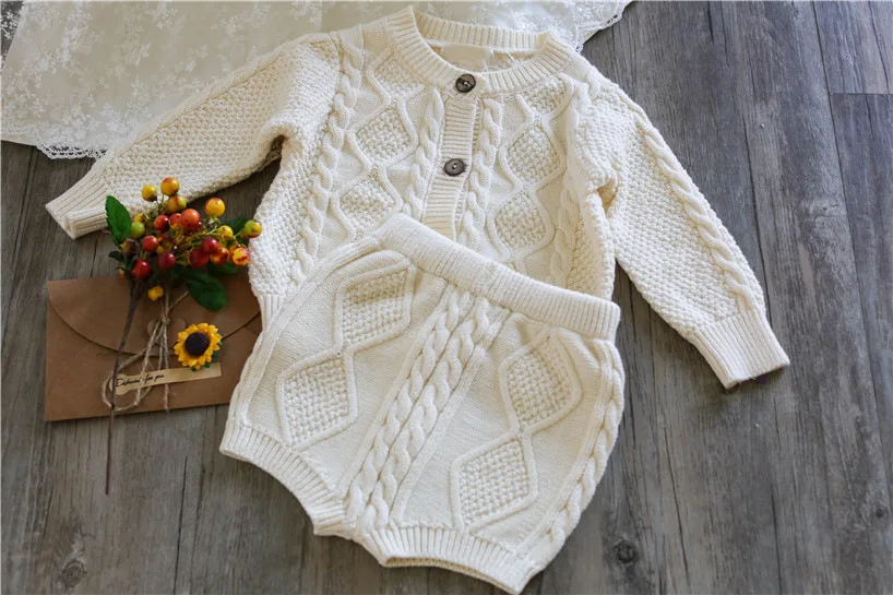 This trendy knitted baby sweater set comes in two-piece knitwear for your little one. Long sleeve button sweater to keep active arms warm. Crewneck, ribbed neckline, cuffs, and hem for a cozy fit. The design comes with a button front style for easy fitting. Pull-on bloomers shorts with a stretchy waistband for quick fitting.