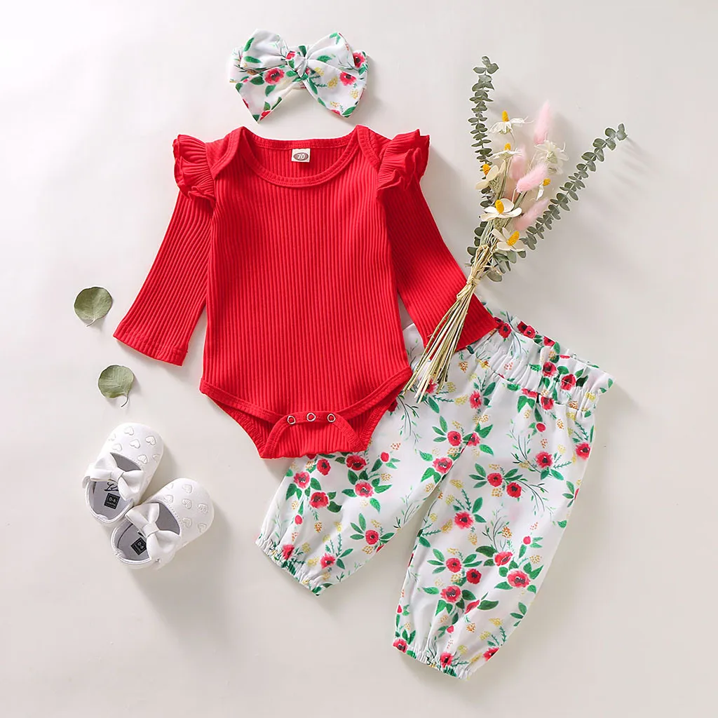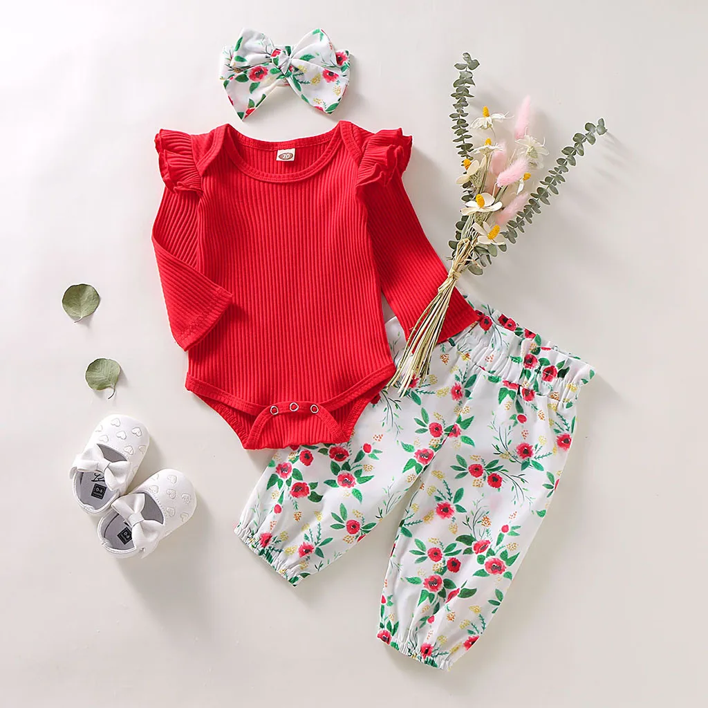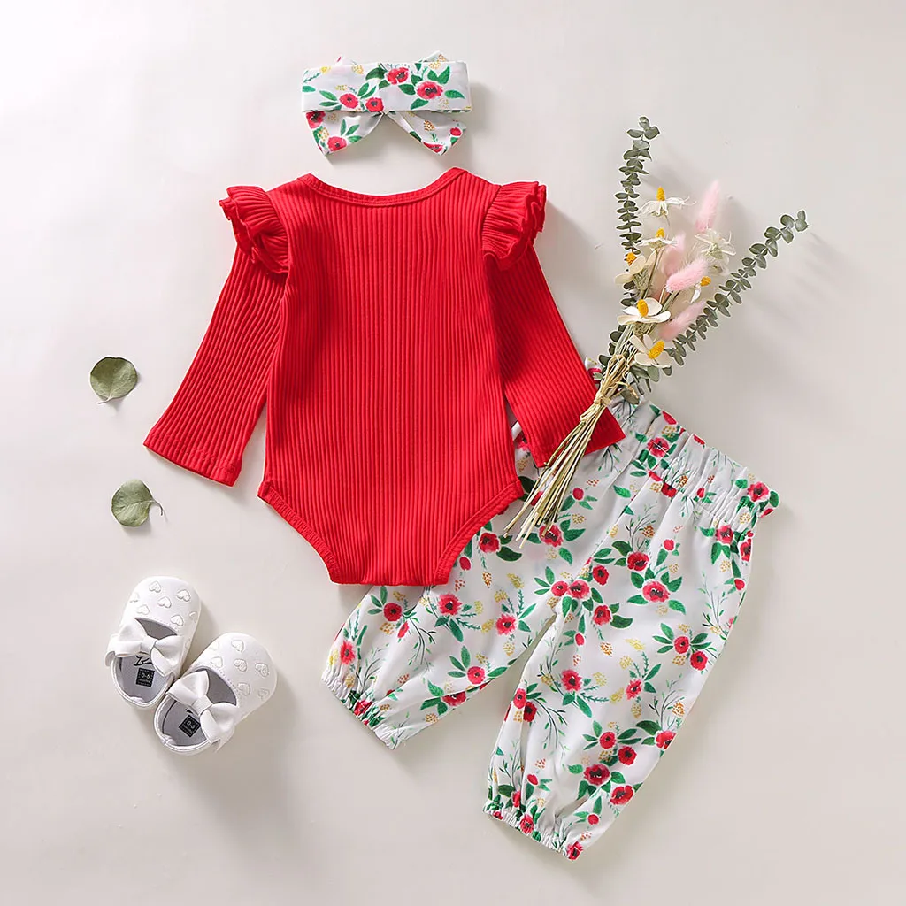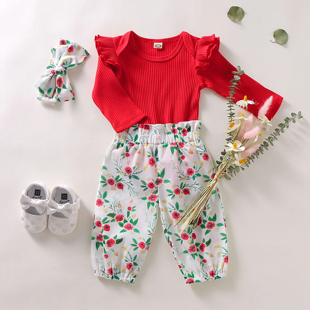 When it comes to adorable fashion that your little ones will love this long sleeve floral romper outfit. This pretty cotton outfit is perfect for a playday or going to the park. Your little one will look cute in this outfit. Set includes a long-sleeve ruffle romper, hairband and floral bloomer pants.