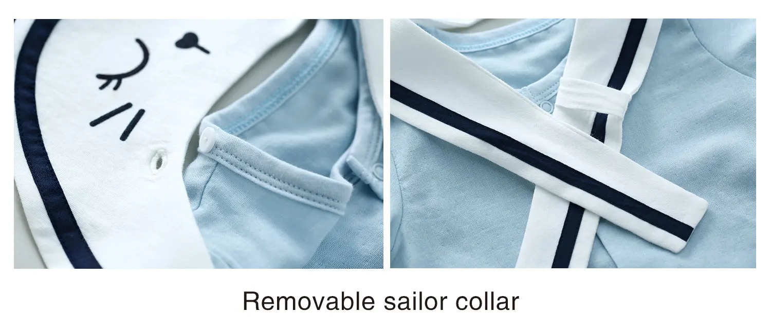 A simple romper for your little ones for the summer wardrobe. This romper features a sailor collar. It is made of soft material. It is breathable and feels cool during the spring or summer seasons. It has different styles you can choose from.