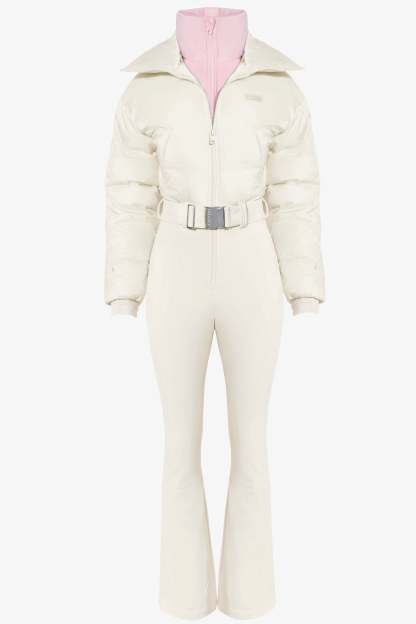 Piste perfection starts here. This waterproof ski suit features a wind-blocking double-layer design with an oversized top and fitted, flared legs for a flattering silhouette. Finished with a high collar, ski pass pocket, and zipped hems for easy boot access, it’s designed to be worn unzipped at the outer layer for a modern, relaxed après-ski look.
