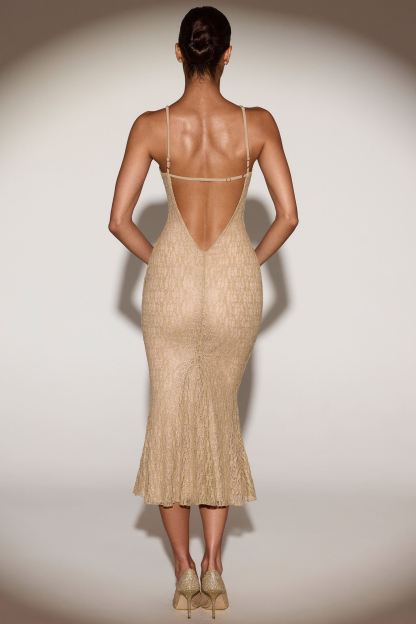 Metallic Lace Plunge Backless Midaxi Dress in Gold